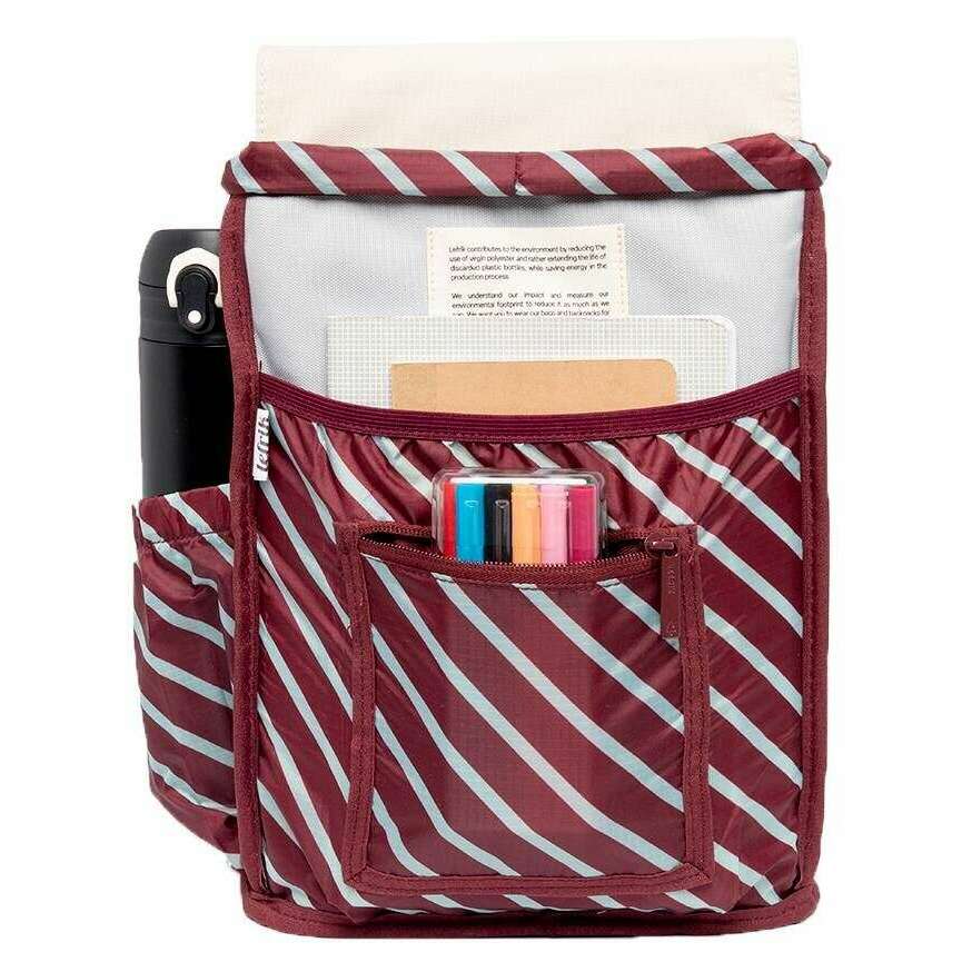 This kaut mini stripes concrete block backpack for men or women is fashioned by the brand Lefrik in a grey colour and is made from 100% recycled oxford rpet fabric. It measures 30cm(height) x 22cm(width) x 13cm(depth). All the bags come complete with lefrik packaging. The Lefrik Kaut Mini Stripes Concrete Block Backpack - Grey/Light Grey/Cream is extremely practical and comfortable. This mini version of the iconic Kaut model features a large main compartment and a separate pocket for notebooks or small electronic devices. Perfect for school, work or play, this backpack is lightweight and water resistant. The quick access pocket on the flap and security pocket on the back allow you to store small items comfortably. With just the right amount of space, this vegan and sustainable backpack is designed for convenience.