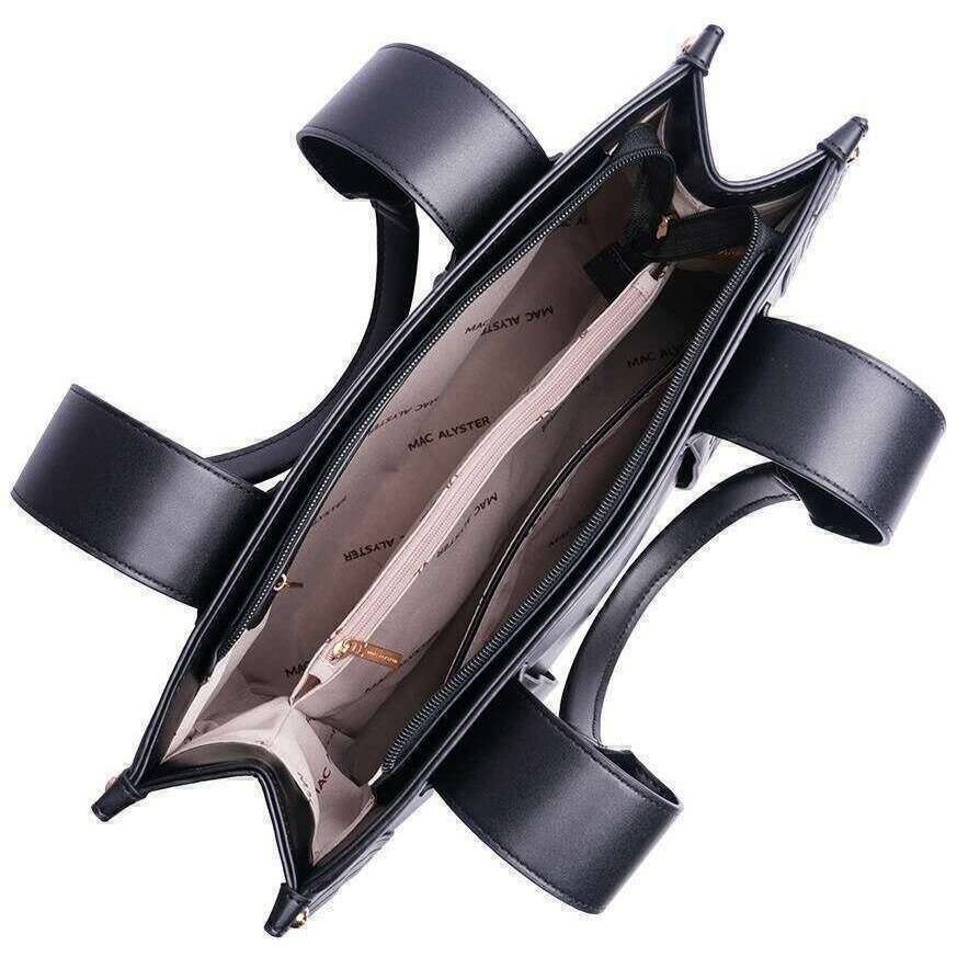 • 2 Shoulder Straps , Zipper Closure , 2 Main Compartments , Middle Zipper Pocket , 1 Slip Pocket , 1 Interior Zipper Pocket , Gold Metal Hardware , Fully Lined , Studs on Base , Mac Alyster Branding , Dust Bag Included