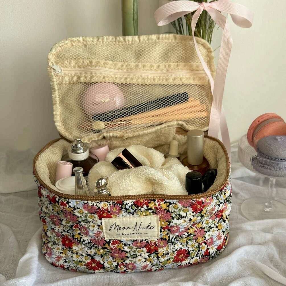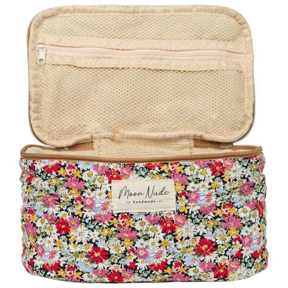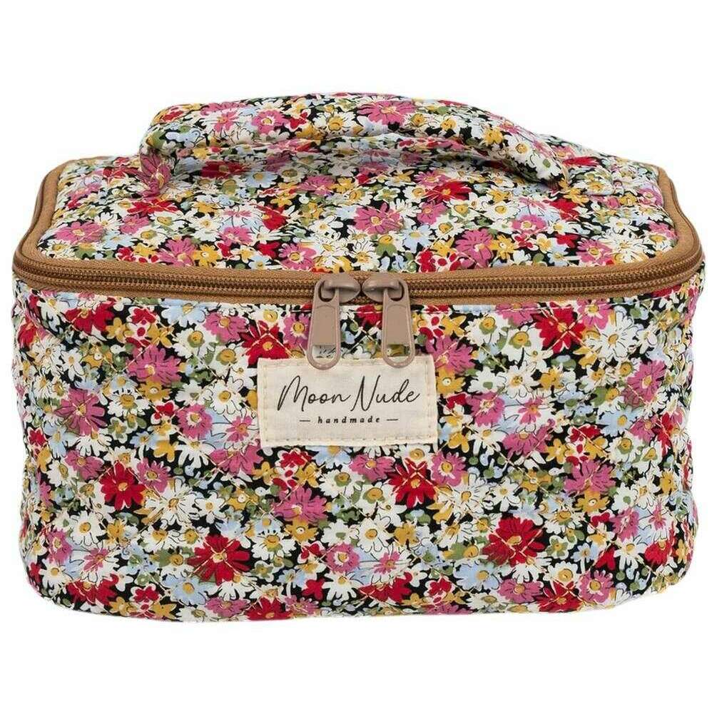 Perfect for women is this Moon Nude red/pink/white autumn vanity bag, it is also made from 100% cotton. It measures 16cm(height) x 22cm(width) x 14cm(depth). It is recommended to wash by hand in cold water with a mild detergent, or maching wash inside out on a delicate cycle. to keep this bag in good condition. All the bags come complete with moon nude packaging. The Moon Nude Autumn Vanity Bag - Red/Pink/White is an absolute necessity for travelling or everyday use. This vanity bag is guaranteed to keep all your makeup or skin care in one place, whilst also being stylish and fashionable with its handmade quilted design.