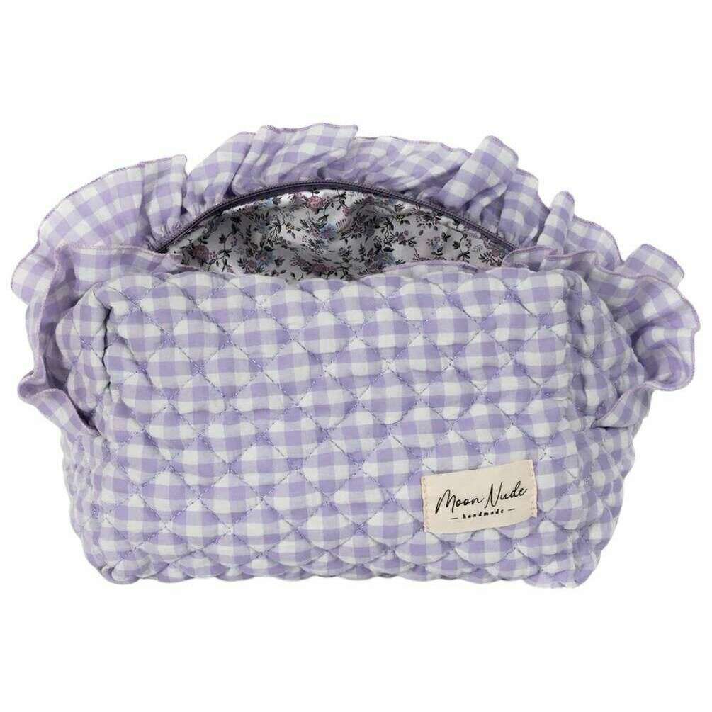 This women's coquette large makeup bag by the brand Moon Nude is made from 100% cotton and is showcased in purple. It measures 15cm(height) x 25cm(width) x 15cm(depth). It is recommended to wash by hand in cold water with a mild detergent, or maching wash inside out on a delicate cycle. to keep this bag in good condition. All the bags come complete with moon nude packaging. The Moon Nude Coquette Large Makeup Bag - Purple/White is an absolute necessity for your room or everyday bag. This makeup bag is guaranteed to keep all your most used products together and safe, whilst also being stylish and chic with its handmade quilted design.