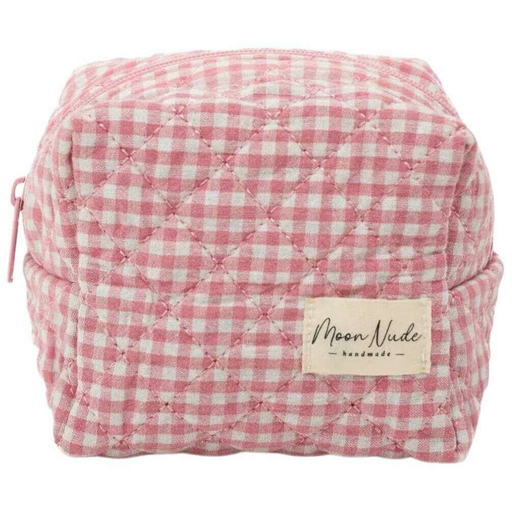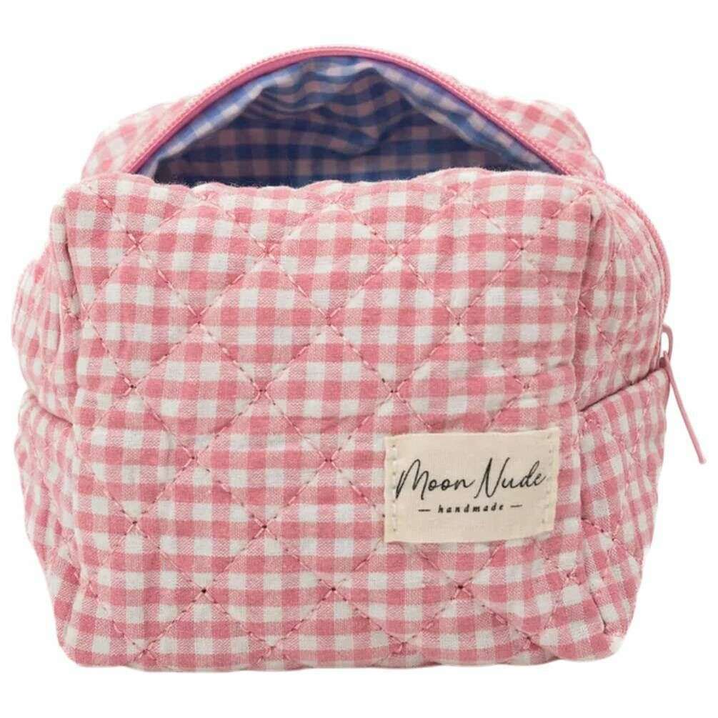 This women's flamingo mini makeup bag by the brand Moon Nude is made from 100% cotton and is showcased in pink. It measures 13cm(height) x 15cm(width) x 11cm(depth). It is recommended to wash by hand in cold water with a mild detergent, or maching wash inside out on a delicate cycle. to keep this bag in good condition. All the bags come complete with moon nude packaging. The Moon Nude Flamingo Mini Makeup Bag - Pink/White/Blue is an absolute necessity for your room or everyday bag. This makeup bag is guaranteed to keep all your most used products together and safe, whilst also being stylish and chic with its handmade quilted design.