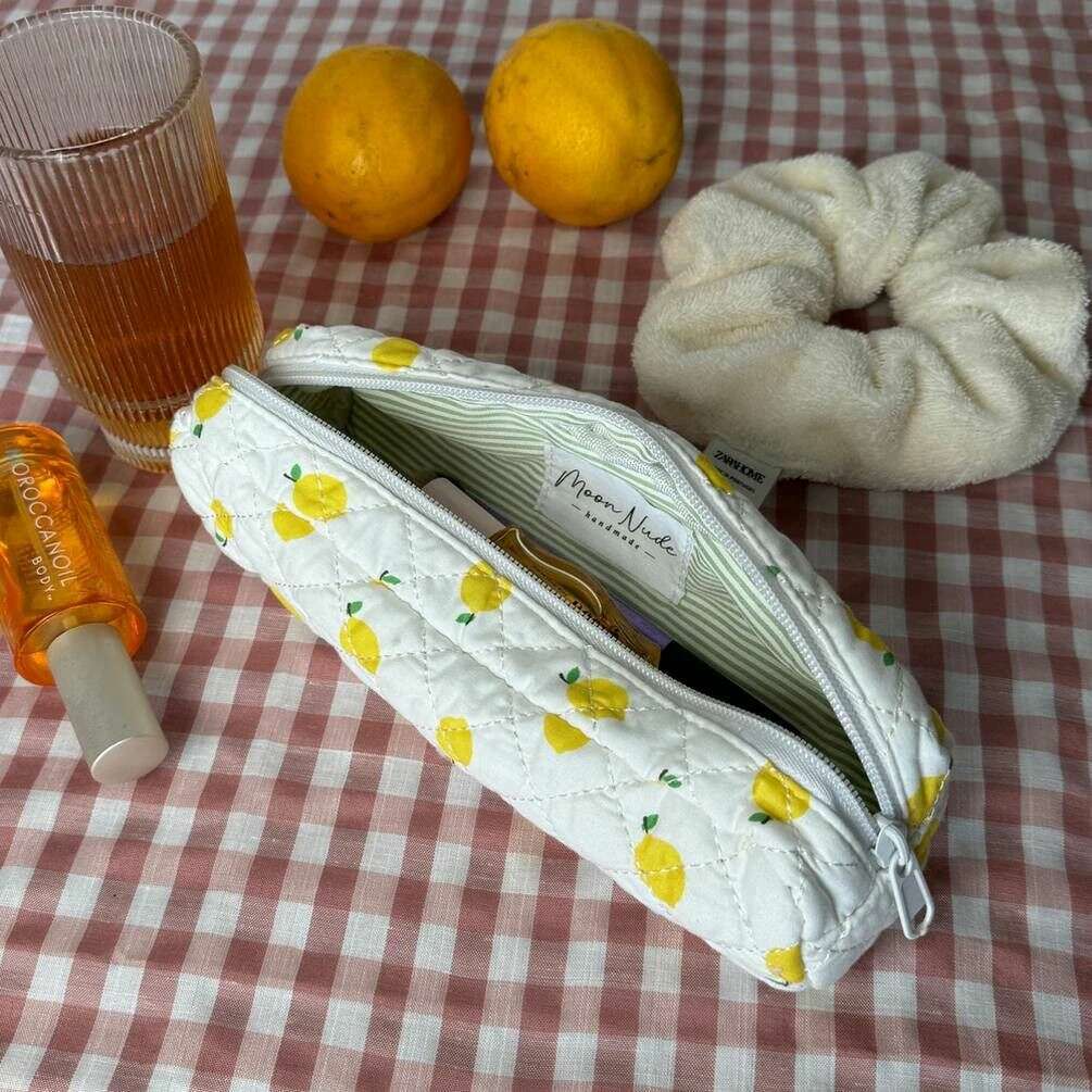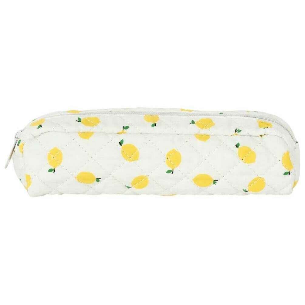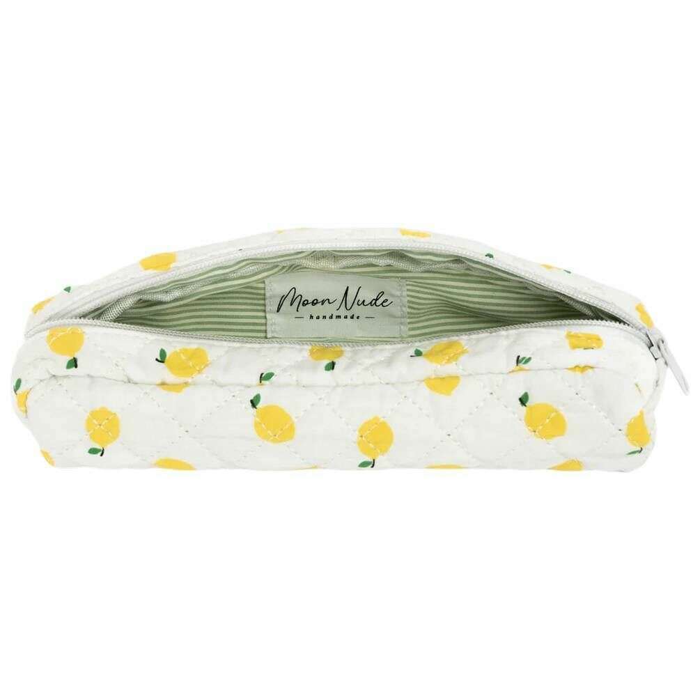This women's lemonade pencil case by the brand Moon Nude is made from 100% cotton and is showcased in white. It measures 7cm(height) x 24cm(width) x 6cm(depth). It is recommended to wash by hand in cold water with a mild detergent, or maching wash inside out on a delicate cycle. to keep this pencil case in good condition. All the pencil cases come complete with moon nude packaging. The Moon Nude Lemonade Pencil Case - White/Yellow is an absolute necessity for work or school. This pencil case is guaranteed to keep all your stationary in one place, whilst also being stylish and chic with its handmade quilted design.