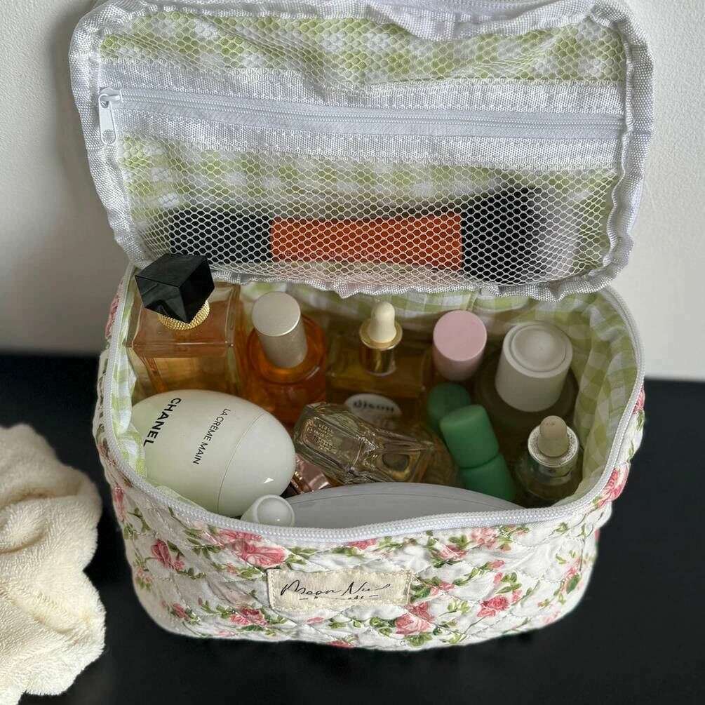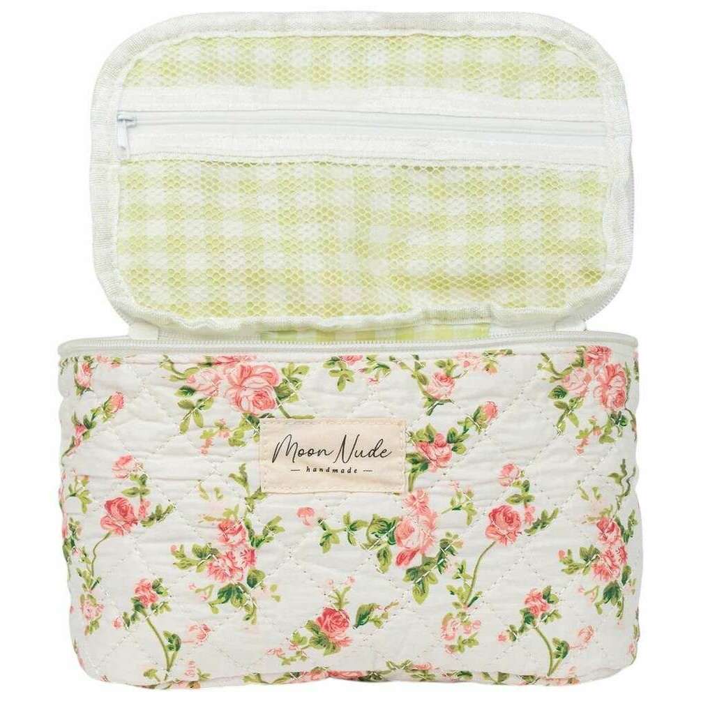 Manufactured from 100% cotton is this white/green/pink women's roze vanity bag by the designer Moon Nude. It measures 16cm(height) x 22cm(width) x 14cm(depth). It is recommended to wash by hand in cold water with a mild detergent, or maching wash inside out on a delicate cycle. to keep this bag in good condition. All the bags come complete with moon nude packaging. The Moon Nude Roze Vanity Bag - White/Green/Pink is an absolute necessity for travelling or everyday use. This vanity bag is guaranteed to keep all your makeup or skin care in one place, whilst also being stylish and fashionable with its handmade quilted design.