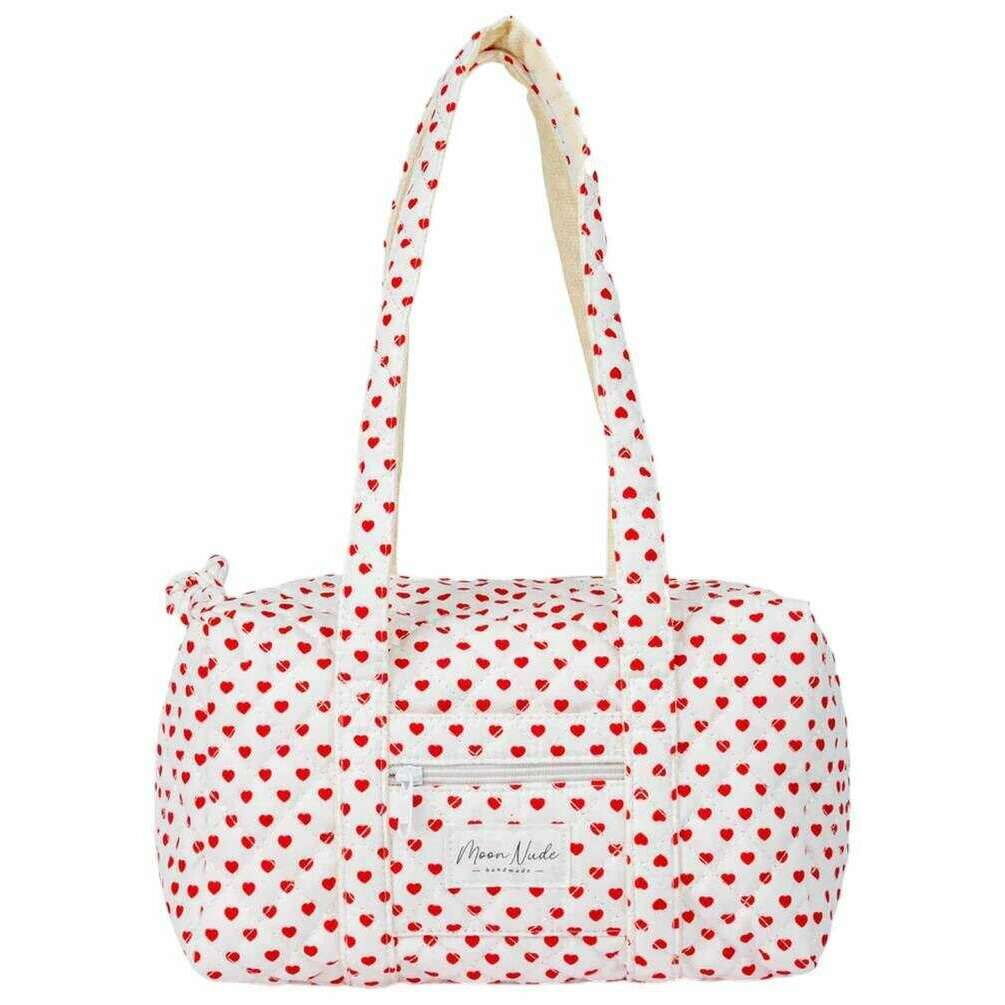 Introducing this women's valentine mini duffel bag by Moon Nude, it is manufactured from 100% cotton in a white/red colour. It measures 18cm(height) x 31cm(width) x 18cm(depth). It is recommended to wash by hand in cold water with a mild detergent, or maching wash inside out on a delicate cycle. to keep this bag in good condition. All the bags come complete with moon nude packaging. The Moon Nude Valentine Mini Duffel Bag - White/Red features a beautiful handmade quilted design. This bag features an exterior zip pocket, a spacious interior and two large handles, perfect for a casual going out bag or as a gift.