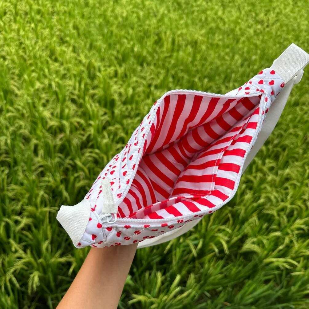 Perfect for women is this Moon Nude white/red valentine mini shoulder bag, it is also made from 100% cotton. It measures 17cm(height) x 28cm(width) x 10cm(depth). It is recommended to wash by hand in cold water with a mild detergent, or maching wash inside out on a delicate cycle. to keep this bag in good condition. All the bags come complete with moon nude packaging. The Moon Nude Valentine Mini Shoulder Bag - White/Red features a beautiful handmade quilted design. Perfect for on the go, whether that s for a special occasion or everyday use. This shoulder bag has a zip closure for safety, an adjustable strap for comfort and interior pockets for convenience.