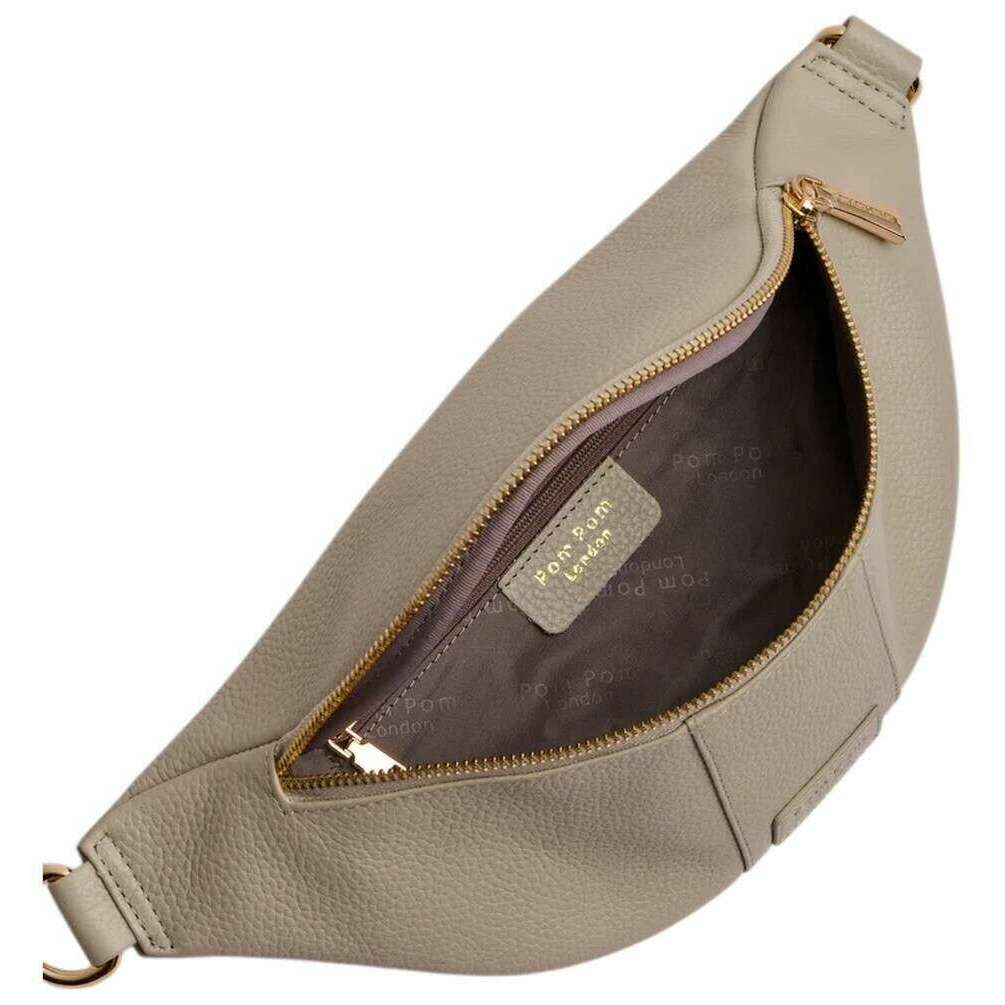 This women's bum bag has been made from 100% full-grain leather, featured in a beige colour and is from the brand Pom Pom London. It measures 12cm(height) x 33cm(width) x 11cm(depth). All the bags come complete with pom pom london packaging. The Pom Pom London Bum Bag - Stone is designed for anyone seeking a stylish, hands?free option that doesn t compromise on elegance. Its sleek silhouette and modern appeal make it the perfect accessory for days on the move, travel adventures, or everyday errands. Crafted from full?grain leather, it delivers both durability and a luxurious finish. The bag features a versatile nylon strap that can be adjusted for a comfortable and personalised fit, whether worn around the waist or styled crossbody. For practical organisation, it includes a separate external zipped compartment that provides quick access to essentials, as well as an internal zip pocket designed to keep valuables secure and neatly arranged. Finishing the look, Pom Pom London s signature gold hardware adds a touch of iconic elegance that elevates this everyday essential.