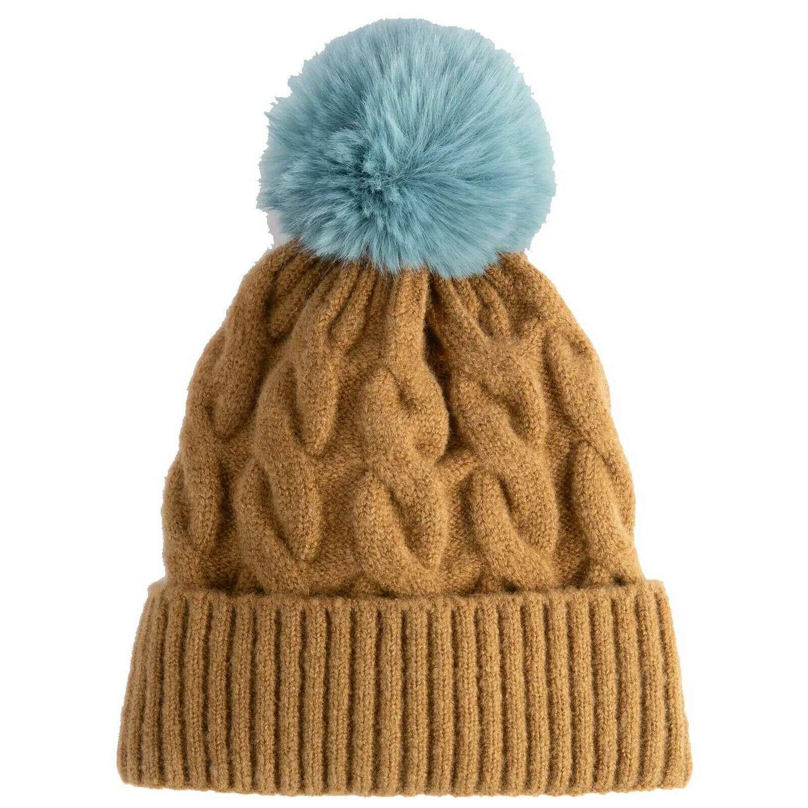 • Faux Fur Pom Pom , Chunky Braid Style Knit , Ribbed Turnt-Up Band