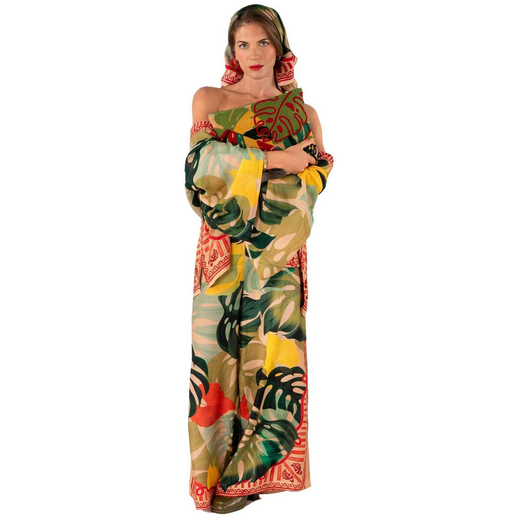 Powder Exotic Leaves Wool Pouch - Red/Green/Beige