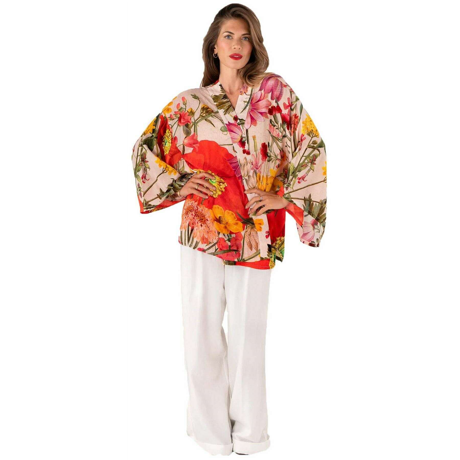 Powder Fine Flowers Kimono Jacket - Red/Beige/Green