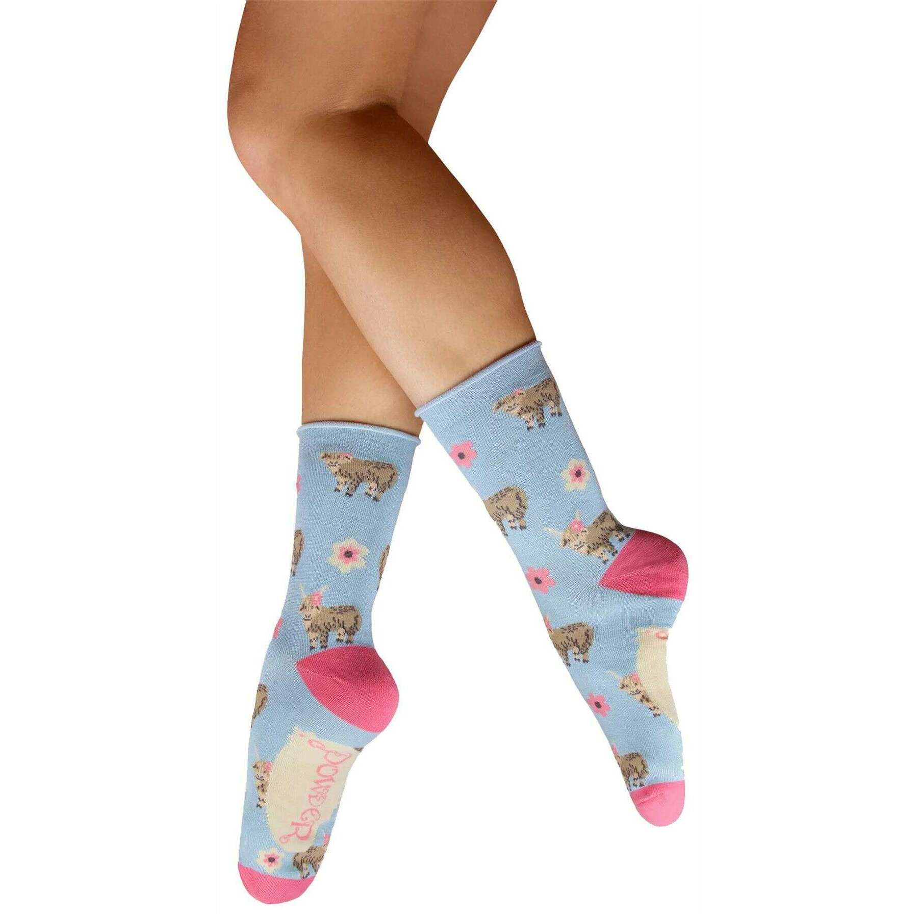 Powder Highland Cow Ankle Socks - Blue/Pink/Beige