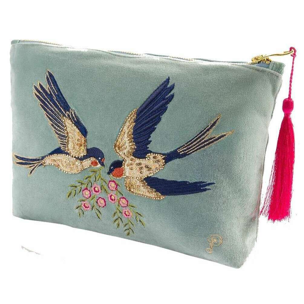 Powder Swooping Swallows Velvet Zip Pouch - Ice Blue