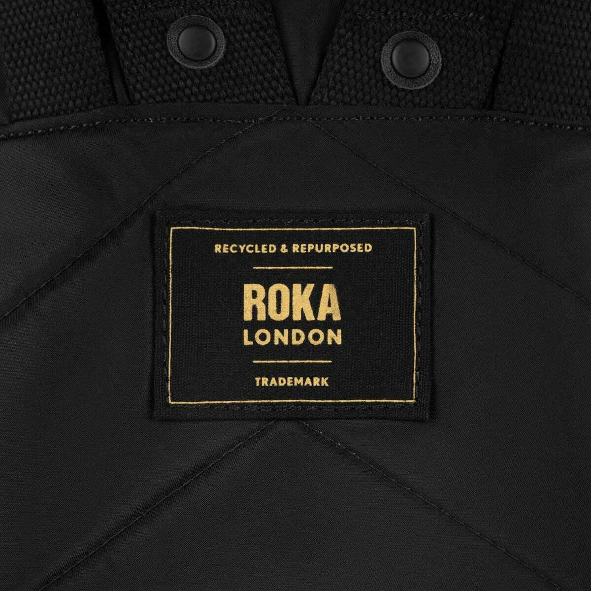 This unisex canfield b gold label small recycled nylon backpack by the brand Roka is made from 100% recycled nylon (triple-coated) and is showcased in black. It measures 33cm(height) x 23.5cm(width) x 9.6cm(depth). All the bags come complete with roka packaging. The Roka Canfield B Gold Label Small Recycled Nylon Backpack - Black/Gold is weather-resistant, durable, lightweight and sleek. The roll top design enables the backpack to have a wide mouth opening which is secured with a sturdy zip and magnetic hold, carrying your essentials couldn t be safer. Featuring a secret wallet pocket and a tablet section, this backpack allows you to carry everything you may need on your day-to-day travels. Carry in complete comfort with the adjustable cotton webbing straps or the twin carry handles. 12 or more plastic bottles are used to make the rPET material for this bag so it is environmentally friendly and also completely vegan.