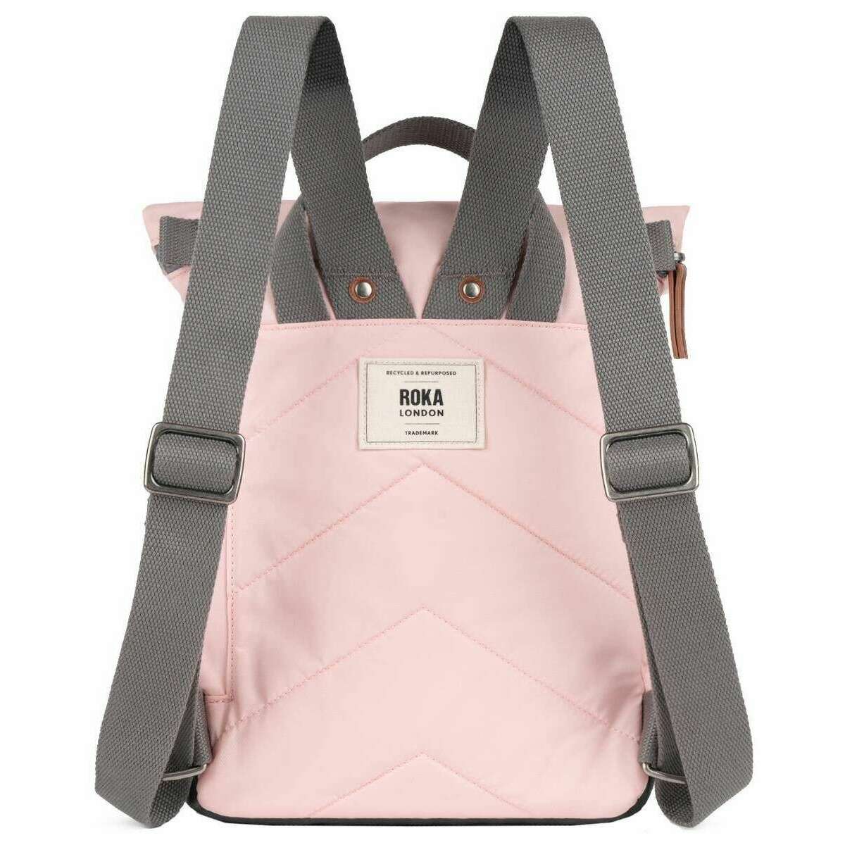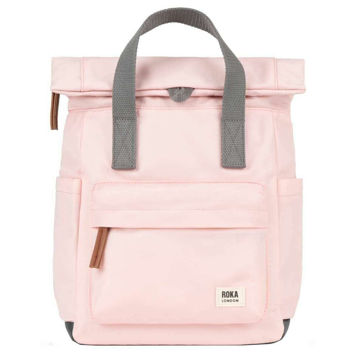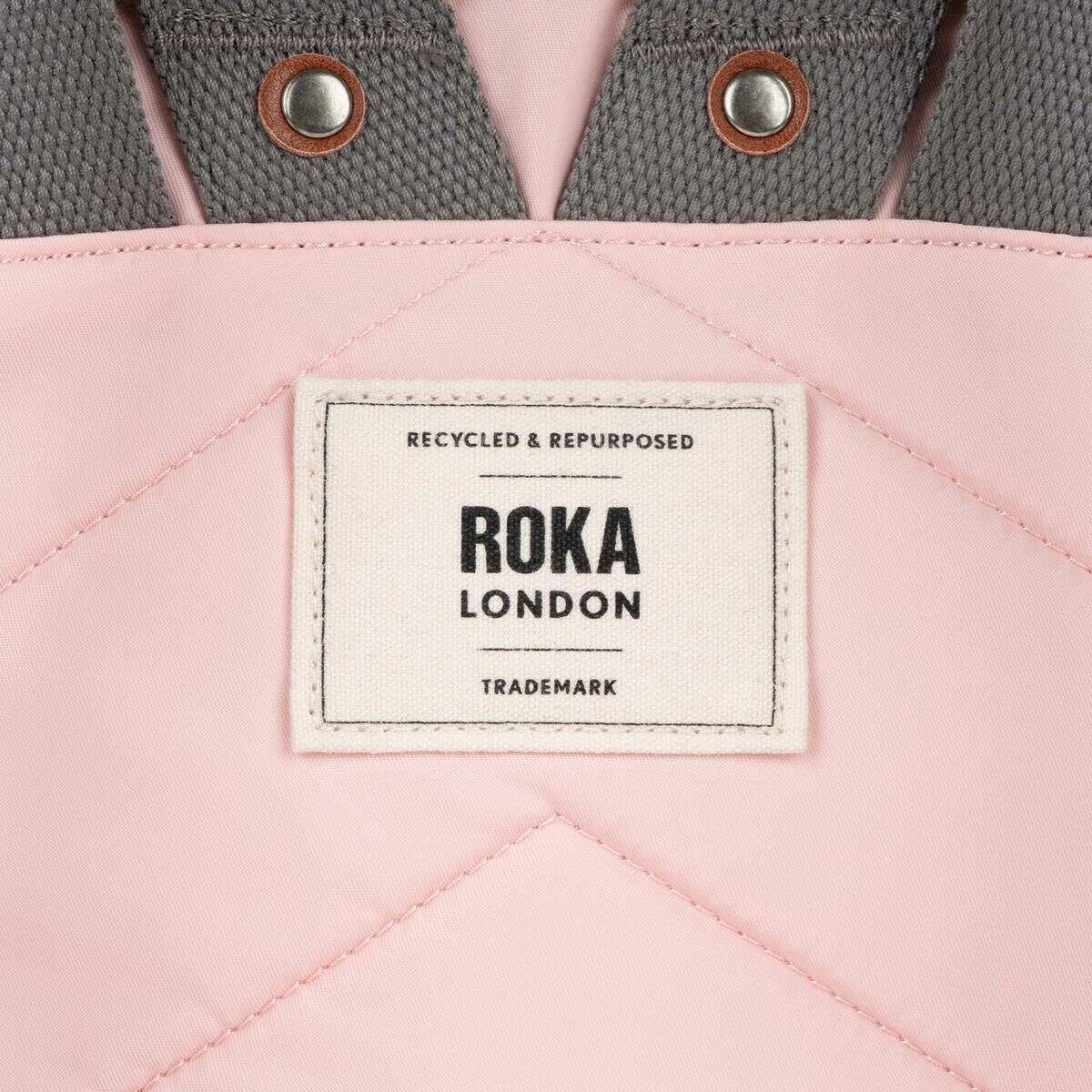 Designer Roka has brought you this unisex 100% recycled nylon bag using english rose pink tones. It measures 33cm(height) x 23.5cm(width) x 9.6cm(depth). It is recommended to clean with a wet sponge or damp cloth to keep this bag in good condition. All the bags come complete with roka packaging. The Roka Canfield B Small Recycled Nylon Backpack - English Rose Pink is weather-resistant, durable, lightweight and sleek. The roll top design enables the backpack to have a wide mouth opening which is secured with a sturdy zip and magnetic hold, carrying your essentials couldn’t be safer. Featuring a secret wallet pocket and a tablet section, this backpack allows you to carry everything you may need on your day-to-day travels. Carry in complete comfort with the adjustable cotton webbing straps or the twin carry handles. Crafted from recycled nylon ensures this bag is vegan friendly and sustainable.