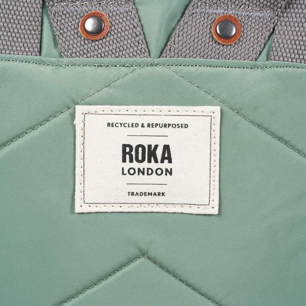 This unisex canfield b small recycled nylon backpack by the brand Roka is made from 100% recycled nylon (triple-coated) and is showcased in green. It measures 33cm(height) x 23.5cm(width) x 9.6cm(depth). All the bags come complete with roka packaging. The Roka Canfield B Small Recycled Nylon Backpack - Frost Green is weather-resistant, durable, lightweight and sleek. The roll top design enables the backpack to have a wide mouth opening which is secured with a sturdy zip and magnetic hold, carrying your essentials couldn t be safer. Featuring a secret wallet pocket and a tablet section, this backpack allows you to carry everything you may need on your day-to-day travels. Carry in complete comfort with the adjustable cotton webbing straps or the twin carry handles. Crafted from recycled nylon ensures this bag is vegan friendly and sustainable.