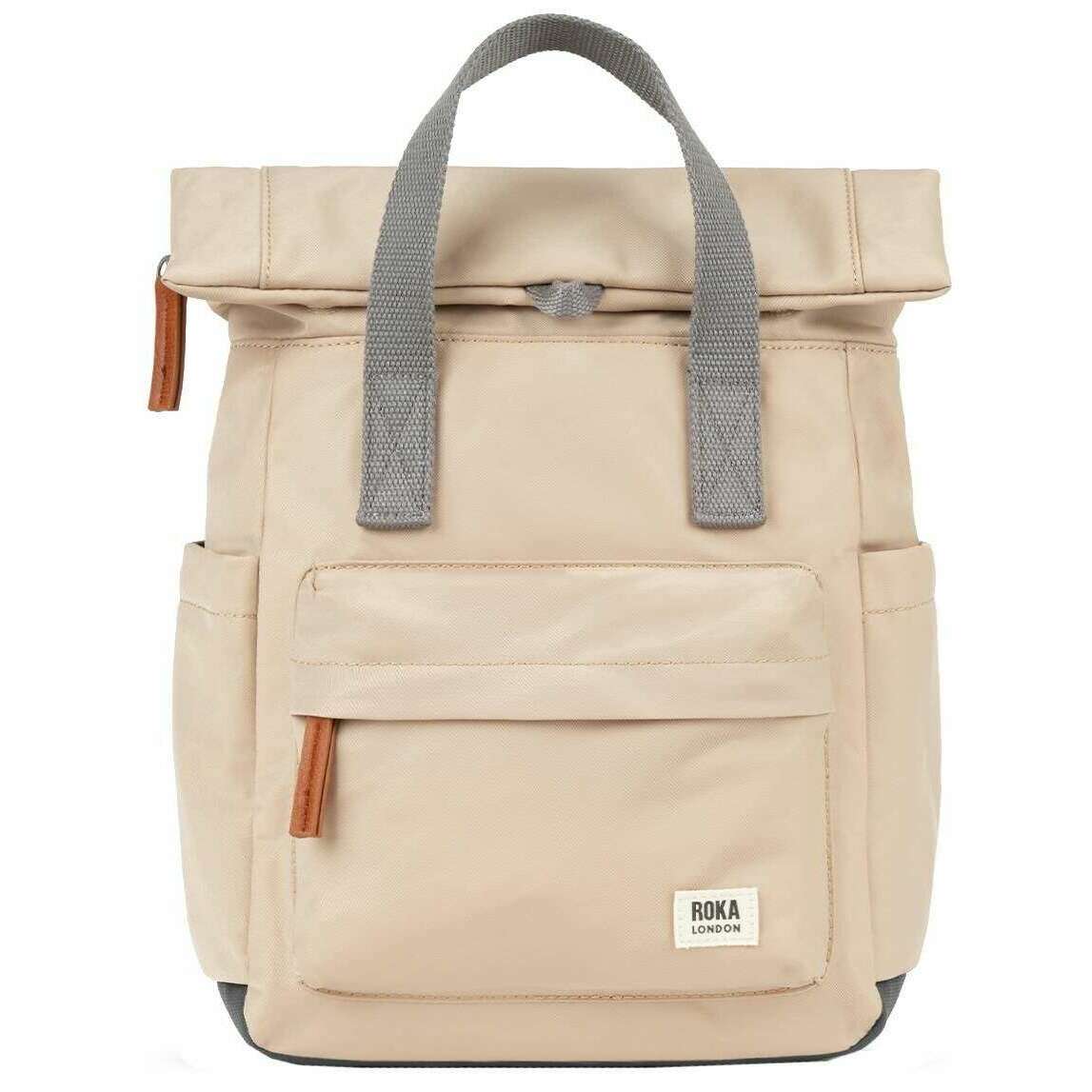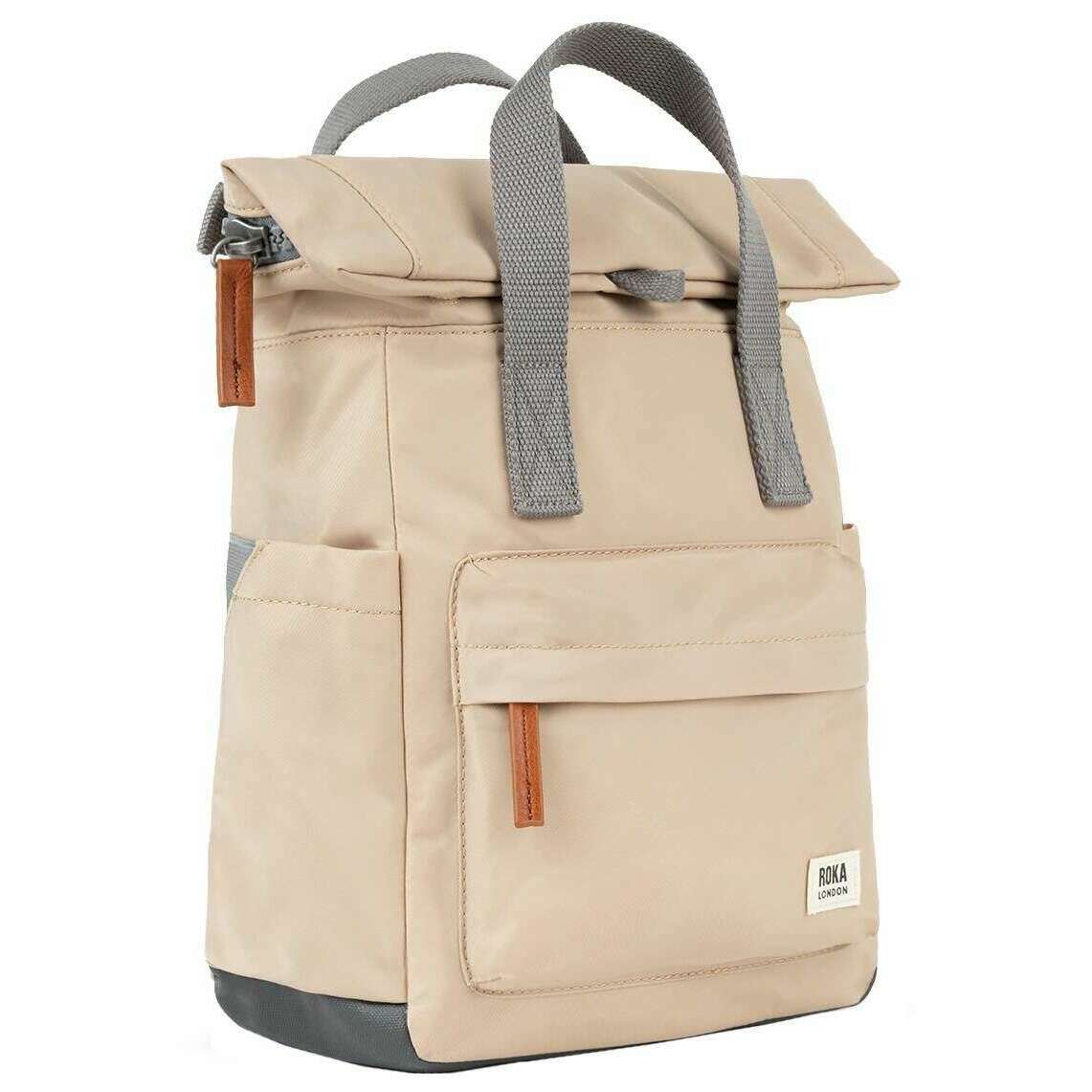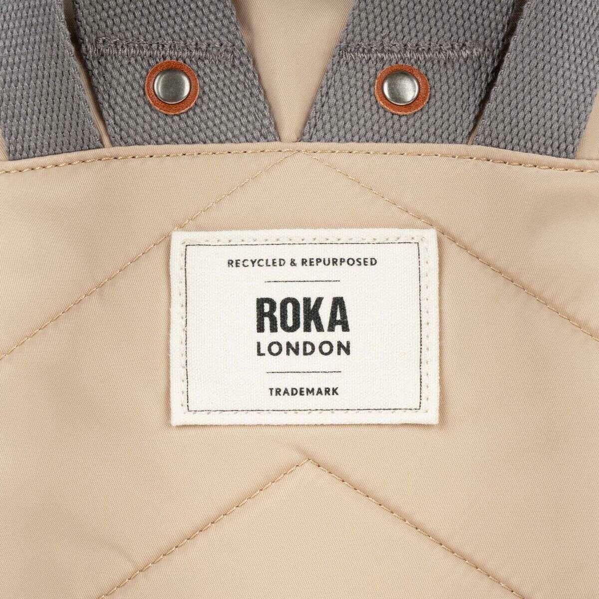 This canfield b small recycled nylon backpack for men or women is fashioned by the brand Roka in a beige colour and is made from 100% recycled nylon. It measures 33cm(height) x 23.5cm(width) x 9.6cm(depth). It is recommended to clean with a wet sponge or damp cloth to keep this bag in good condition. All the bags come complete with roka packaging. The Roka Canfield B Small Recycled Nylon Backpack - Sand Beige is weather-resistant, durable, lightweight and sleek. The roll top design enables the backpack to have a wide mouth opening which is secured with a sturdy zip and magnetic hold, carrying your essentials couldn’t be safer. Featuring a secret wallet pocket and a tablet section, this backpack allows you to carry everything you may need on your day-to-day travels. Carry in complete comfort with the adjustable cotton webbing straps or the twin carry handles. Crafted from recycled nylon ensures this bag is vegan friendly and sustainable.