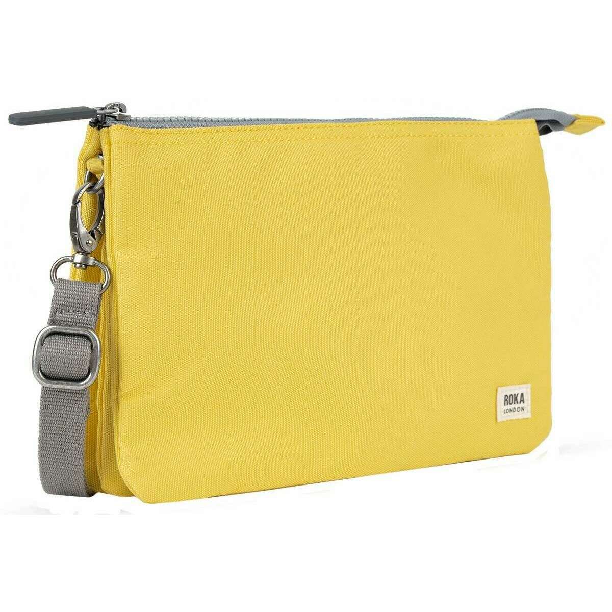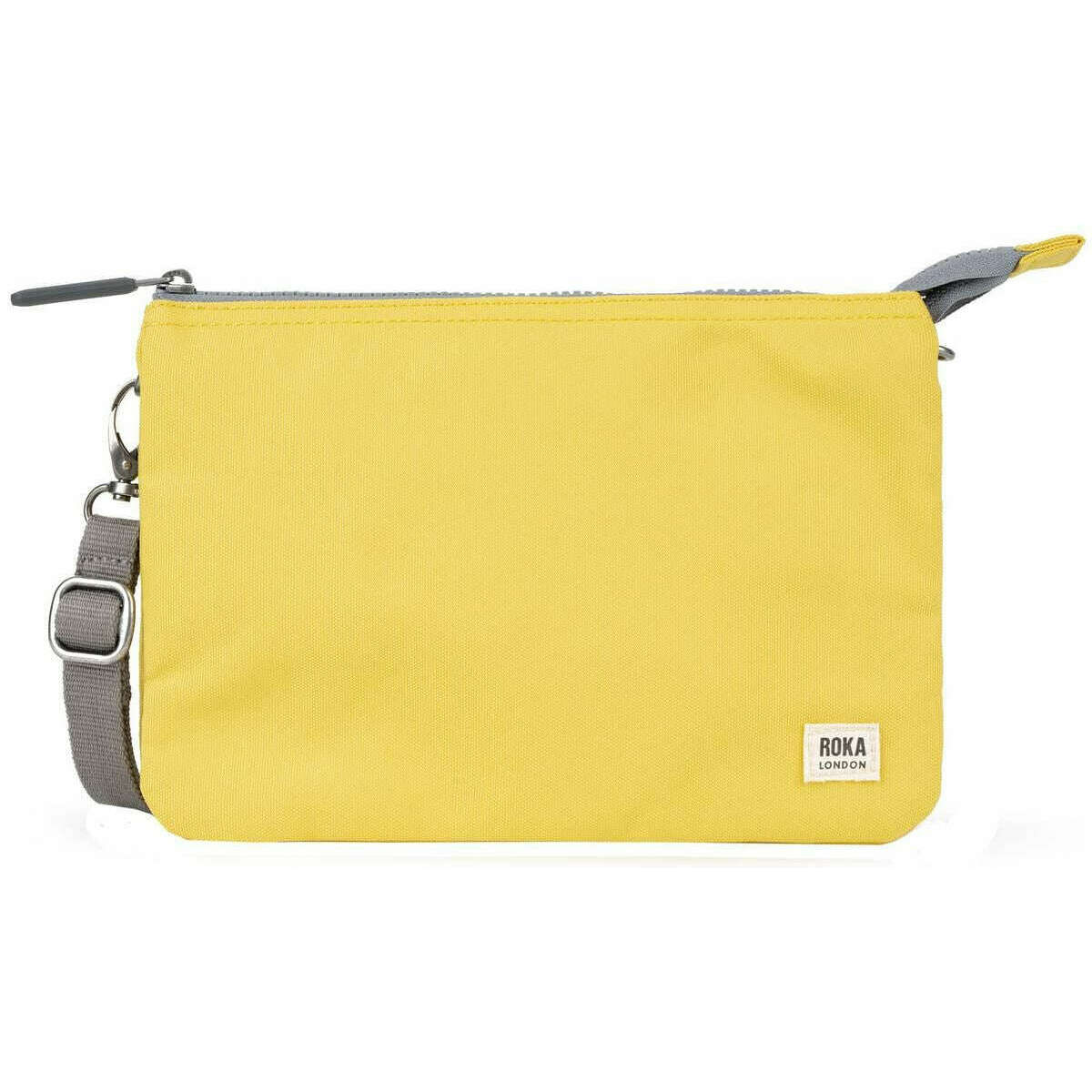 This carnaby xl recycled canvas crossbody bag for men or women is fashioned by the brand Roka in a yellow colour and is made from 100% weather resistant recycled canvas. It measures 17cm(height) x 25cm(width) x 3cm(depth). It is recommended to clean with a wet sponge or damp cloth to keep this bag in good condition. All the bags come complete with roka packaging. The Roka Carnaby XL Recycled Canvas Crossbody Bag - Lemonade Yellow offers practicality and organisation when it comes to your day-to-day essentials with its weather resistant recycled canvas material. It has three separate compartments, each with various pockets and slots for cards, coins and notes as well as being big enough to store most mobile phones. It is the perfect accessory that allows you to carry your wallet as a bag with a little extra room for a few more bits and bobs. It is fitted with adjustable webbed strap and is designed to be durable and lightweight as well as sustainable. The Carnaby XL is an all-round winner.
