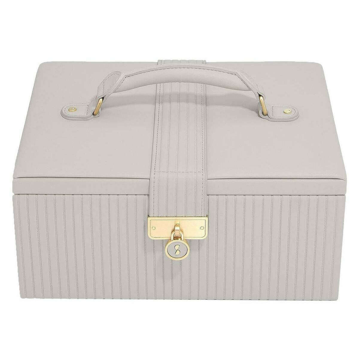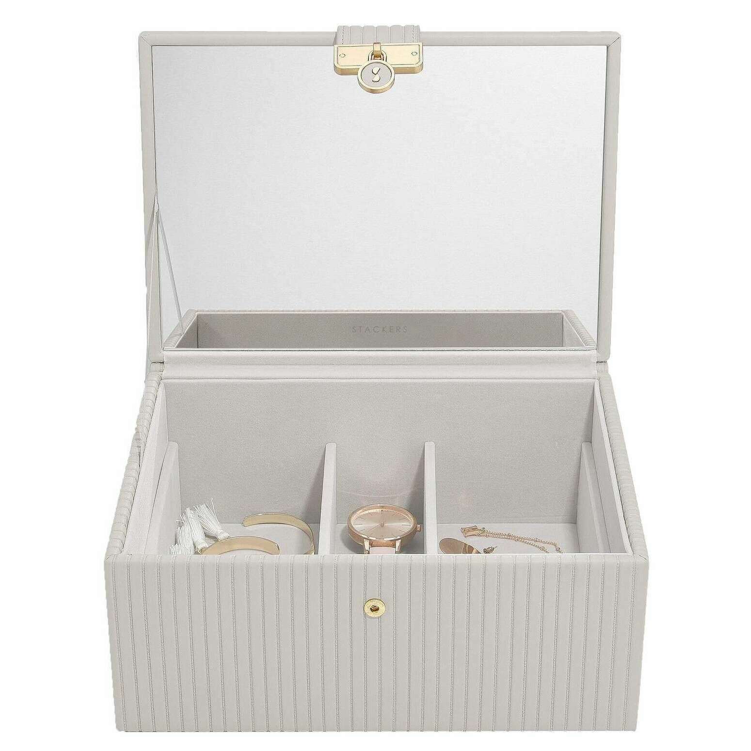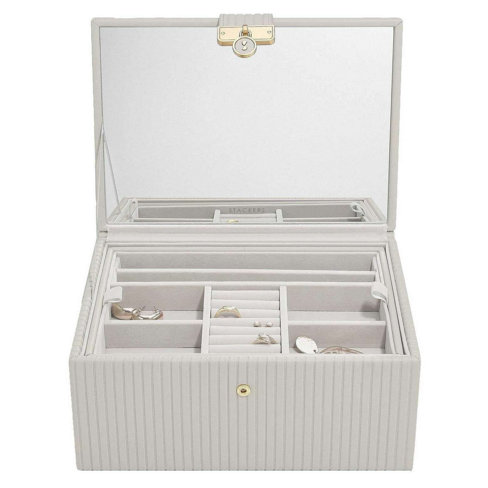 This classic jewellery box for women is fashioned by the brand Stackers in a grey colour and is made from faux leather and velvet. It measures 16.3cm(height) x 25cm(width) x 18cm(depth). All the jewellery boxes come complete with stackers packaging. The Stackers Classic Jewellery Box - Limestone Grey features a beautiful grey ribbed design, giving this jewellery box a classy and sophisticated look. Complete with ring rolls for rings and stud earrings as well as a larger section underneath for chunkier jewellery and accessories.