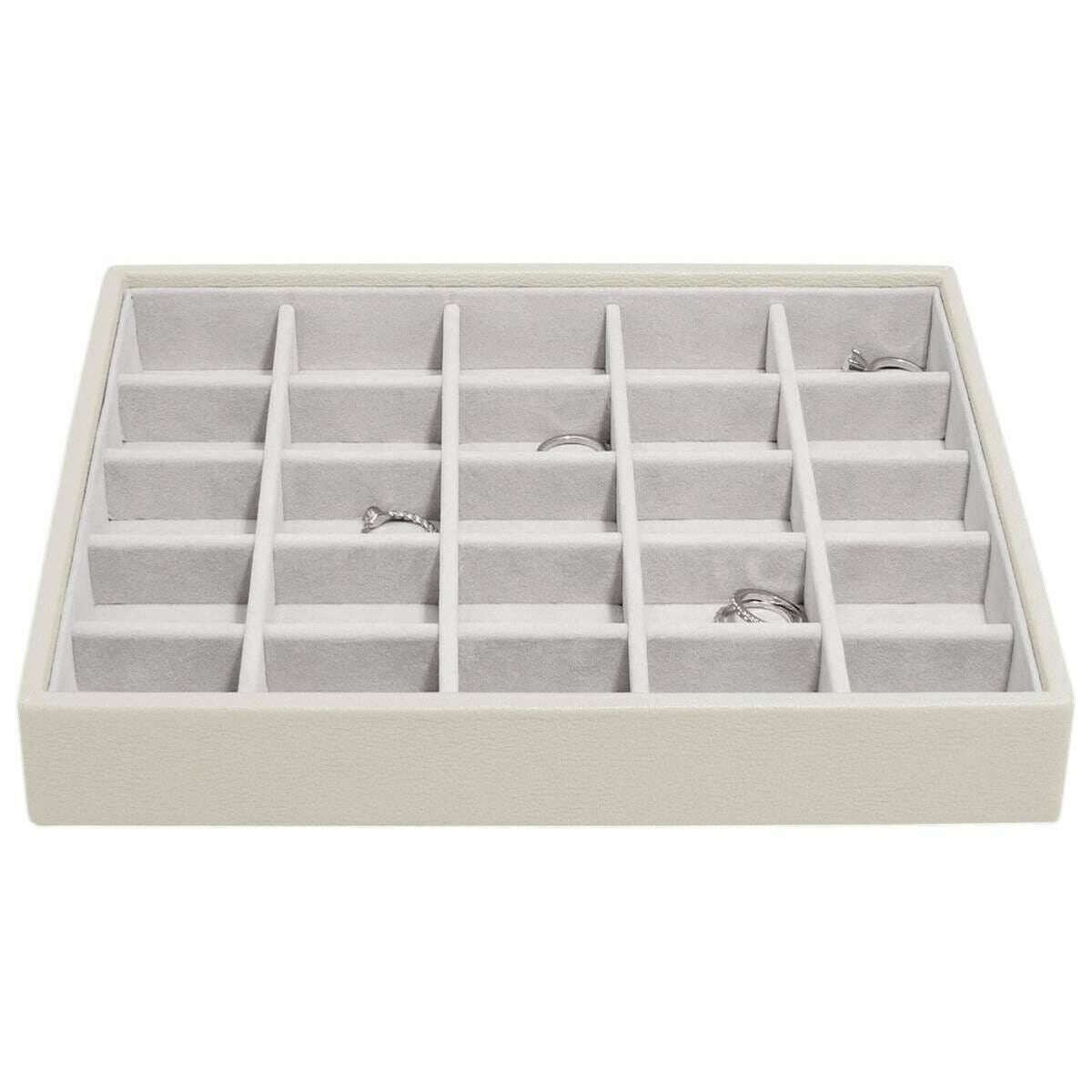 Perfect for women is this Stackers oatmeal cream classic jewellery box set of 5, it is also made from faux leather and velvet. It measures 25.5cm(height) x 25cm(width) x 18cm(depth). It is recommended to wipe clean to keep this jewellery box in good condition. All the jewellery boxes come complete with stackers packaging. The Stackers Classic Jewellery Box set of 5 - Oatmeal Cream is certain to impress with its unbelievable amount of space. Featuring a top lidded section for those precious little pieces, a middle 25 section tray for those charms or rings, another middle tray with three sections to hold your bracelets and necklaces with ring rolls to store more rings and earrings, and then a deep three section box for those larger items like big bracelets, watches and sunglasses, and finally a deep layer that is open for any other larger pieces. Make this the most ideal jewellery box you can own with it offering so much in the most luxurious way.