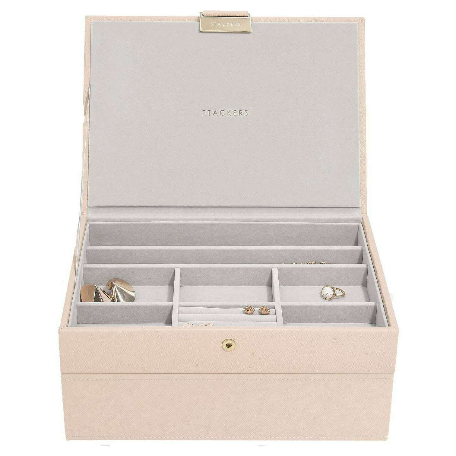 This women's classic set of 2 jewellery box by the brand Stackers is made from faux leather and velvet and is showcased in pink. It measures 11cm(height) x 25cm(width) x 18cm(depth). All the jewellery boxes come complete with stackers packaging. The Stackers Classic Set of 2 Jewellery Box - Blush Pink Raffia features a unique pink raffia jewellery box design. This jewellery box is perfect for storing all your jewellery items! Comes complete with two layers and multiple sized sections for earrings and bracelets and a larger section for watches and bangles.