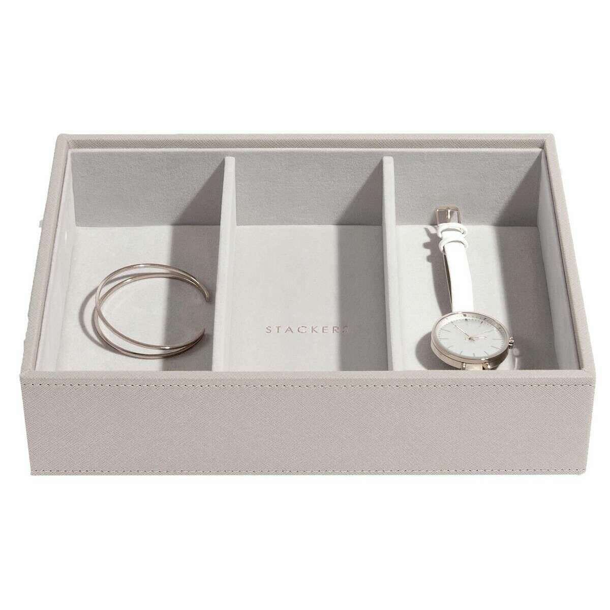 Manufactured from faux leather and velvet is this taupe women's classic set of 4 jewellery box by the designer Stackers. It measures 19.5cm(height) x 25cm(width) x 18cm(depth). All the jewellery boxes come complete with stackers packaging. The Stackers Classic Set of 4 Jewellery Box - Taupe features a classic taupe jewellery box design. This jewellery box is perfect for storing all your jewellery items! Comes complete with four layers and multiple sized sections for earrings, rings and bracelets and a larger section for watches and bangles.