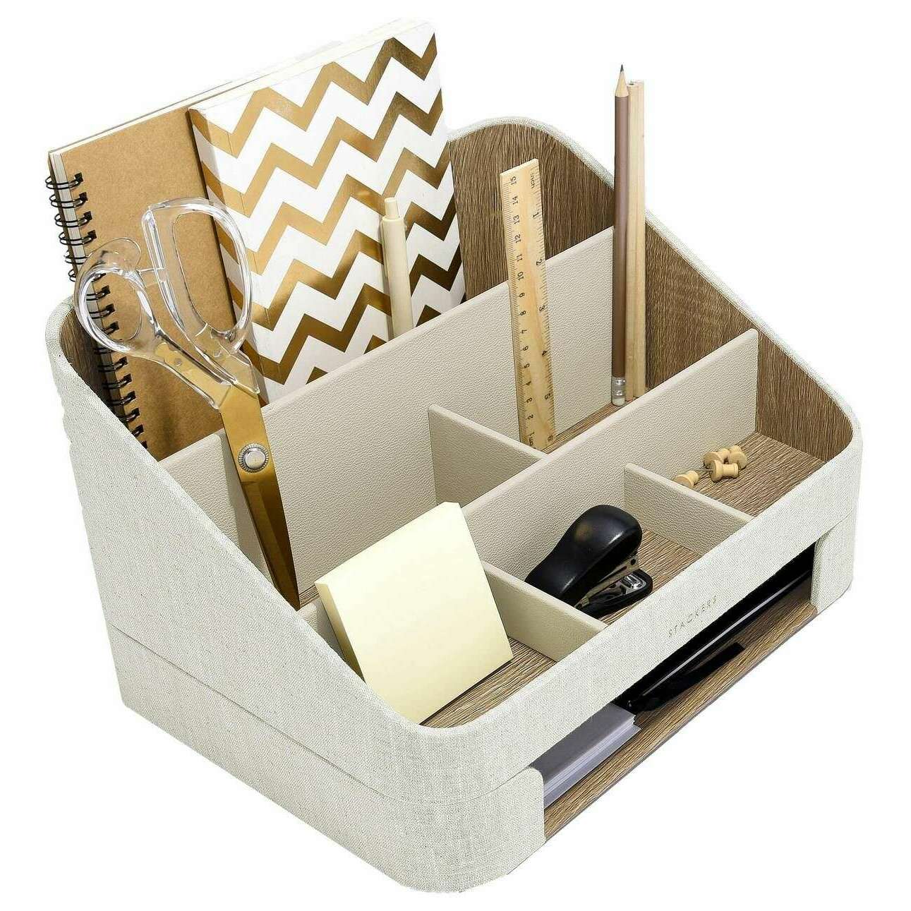 Brought to you by the brand Stackers, this oatmeal beige/linen beige women's desk organiser set is made from faux leather. It measures 20cm(height) x 25cm(width) x 33cm(depth). All the desk accessories come complete with stackers packaging. The Stackers Desk Organiser Set - Oatmeal Beige/Linen Beige features a beautiful beige and brown design. This desk organiser has many sections for stationary, notebooks and many more trinkets. Comes complete with a letter tray for extra storage.
