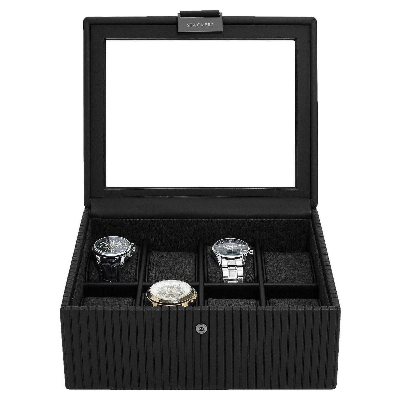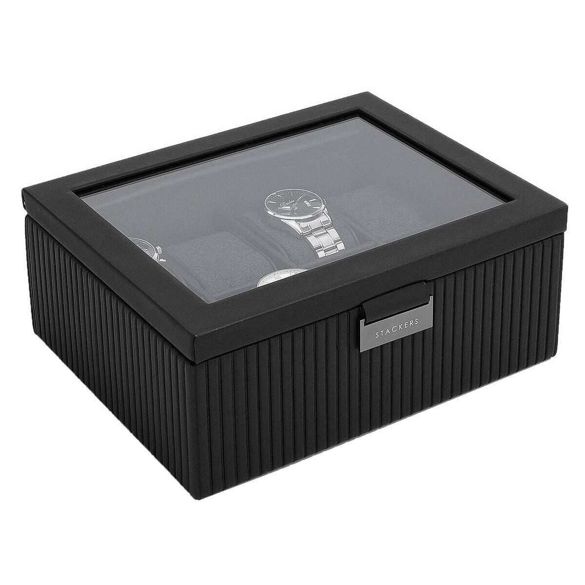 Brought to you by the brand Stackers, this black men's fluted 8 piece watch box is made from faux leather. It measures 10cm(height) x 19.5cm(width) x 24cm(depth). All the gentlemen's boxes come complete with stackers packaging. The Stackers Fluted 8 Piece Watch Box - Black features a classy black ribbed design. This watch box has room for eight watches and features a clear glass lid for easy viewing!
