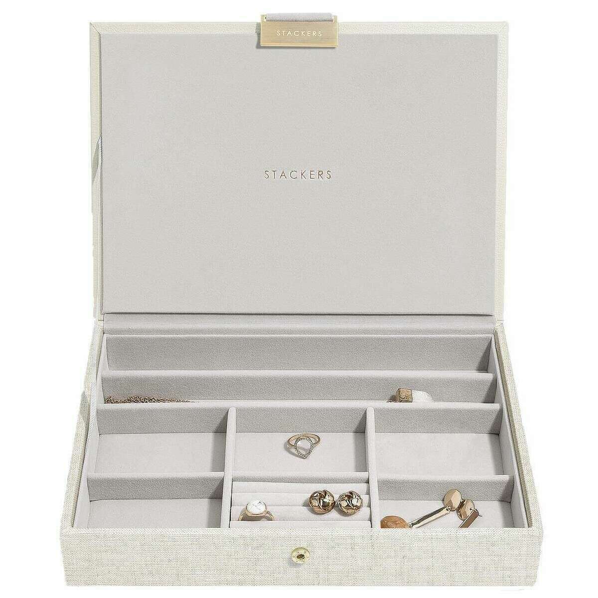 Designer Stackers has brought you this women's faux leather and linen jewellery box using oatmeal/linen beige tones. It measures 18.2cm(height) x 25cm(width) x 18cm(depth). All the jewellery boxes come complete in stackers packaging. The Stackers Set of 4 Classic Jewellery Box - Oatmeal/Linen Beige will be certain to impress with its unbelievable amount of space. Featuring a top lidded section for those precious little pieces, a middle 25 section tray for those charms or rings, another middle tray with three sections to hold your bracelets and necklaces with ring rolls to store more rings and earrings, and then the bottom is a deep three section box for those larger items like big bracelets, watches and sunglasses. Make this the most ideal jewellery box you can own with it offering so much in the most luxurious way.