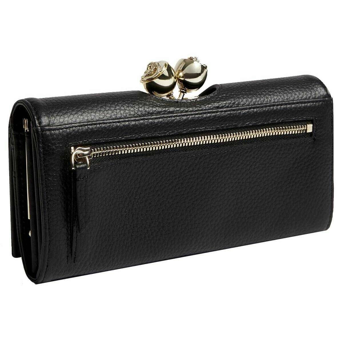 Perfect for women is this Ted Baker black roosali rose detail large leather bobble purse, it is also made from 100% bovine leather. It measures 9cm(height) x 14.5cm(width) x 3cm(depth). All the purses come complete in a ted baker gift box. The Ted Baker Roosali Rose Detail Large Leather Bobble Purse - Black has been beautifully crafted to provide sophistication and elegance while organising your cards and cash effortlessly. A standout to this purse are the gorgeous rose bud clasps which offer feminine flair to a simple silhouette. Finished with branding on the front, this purse would make the perfect treat to yourself or a thoughtful gift.