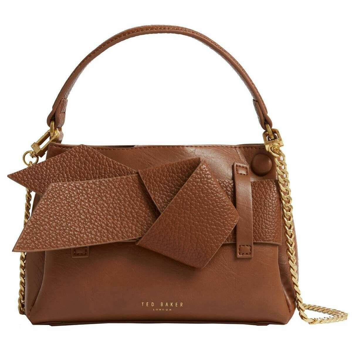 Designer Ted Baker has brought you this women's 100% polyurethane bag using tan tones. It measures 15cm(height) x 20.5cm(width) x 9cm(depth). All the bags come complete with ted baker packaging. The Ted Baker Ssansa Knot Bow Mini Top Handle Bag - Tan is a stunning bag with a standout bow feature on the front that offers unique flair to the classic and timeless design. Fitted with both a top handle and beautiful chain crossbody strap, you can change up the carrying style to whatever suits you and your outfit. Inside you can find a zipped compartment as well as a spacious main section with a strap to secure your belongings. Finished with embossed branding, you can show this piece off wherever you go.