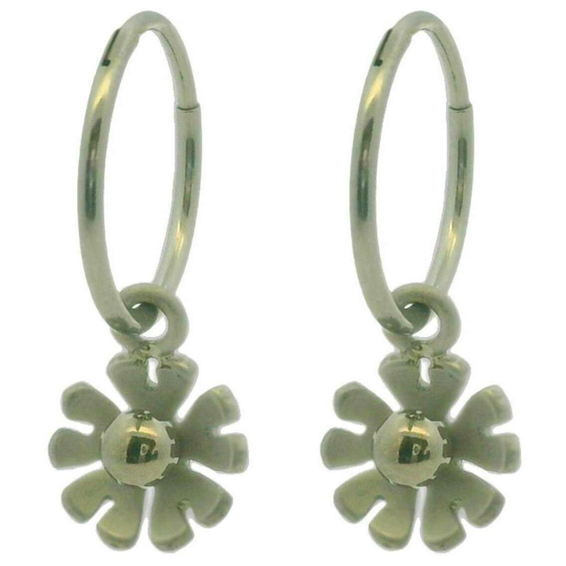 Ti2 Titanium Ten Petal Flower Charm Hoop Earrings - Natural Silver