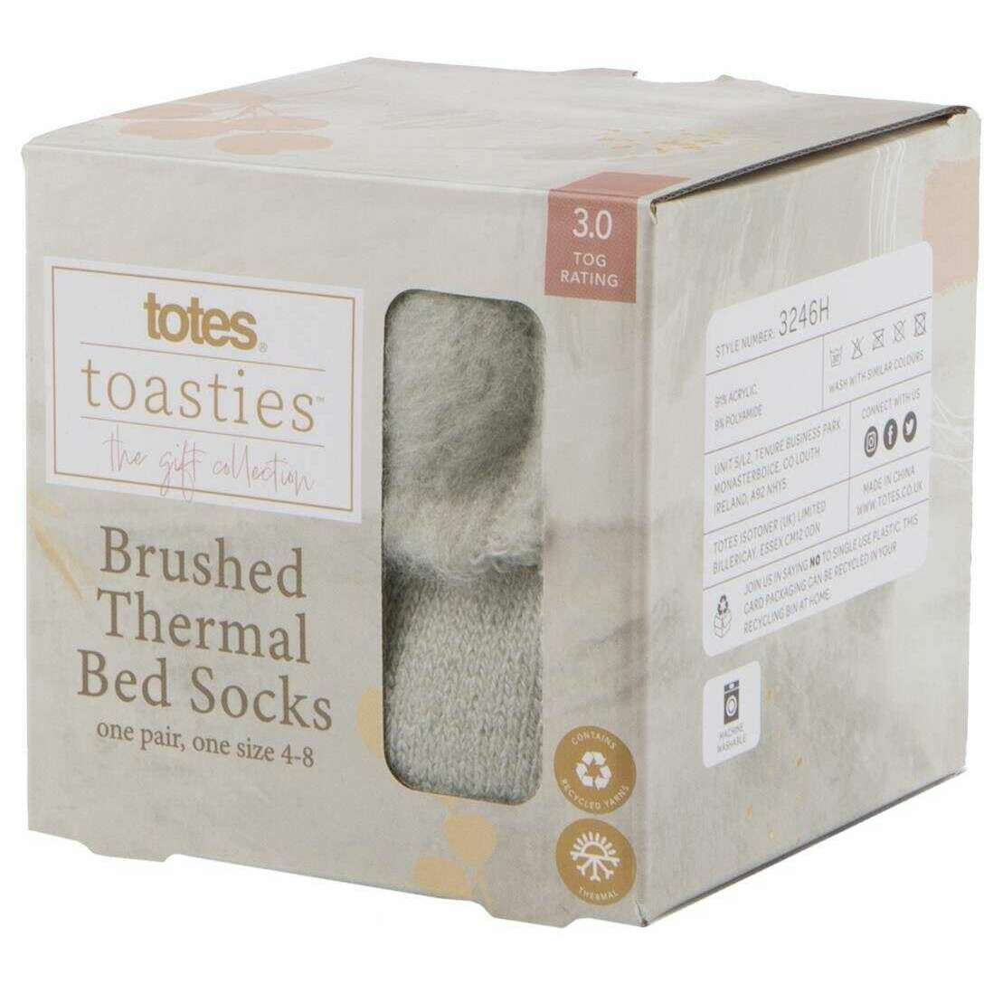 These women's brushed thermal bed socks have been made from 91% acrylic and 9% polyamide, featured in a grey colour and are from the brand Totes Toasties. Also the grey socks are designed in a plain pattern, It is recommended to machine wash at 30 degrees to keep these socks in good condition. All the socks come complete with totes toasties packaging. The Totes Toasties Brushed Thermal Bed Socks - Grey are the perfect socks to keep your feet warm and cosy whilst cuddled up in bed with a hot chocolate with the help of the thermal lining ensuring optimal protection from the cold. These socks have a 3.0 TOG rating meaning these have high level of thermal insulation, being able to retain more body heat. Containing recycled yarns these socks make the perfect gift to your loved ones or yourself.