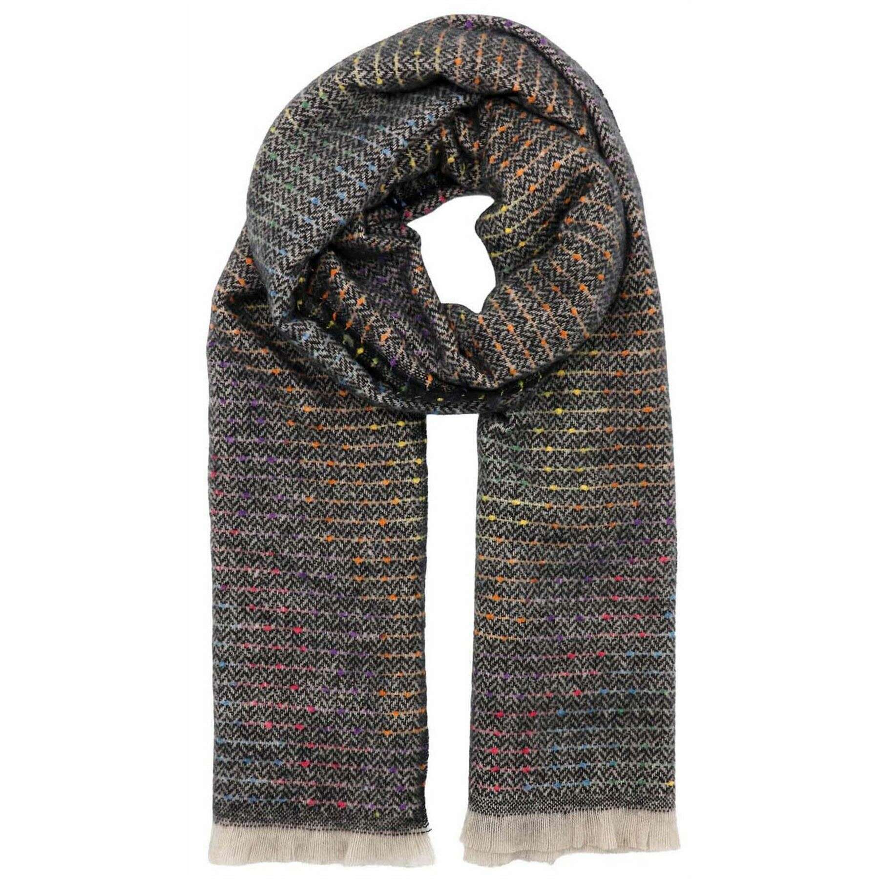 Using black 65% polyester and 35% viscose, this speckled winter weight scarf by Zelly is perfect for women and a must have. It measures 180cm(height) x 65cm(width). It is recommended to machine wash at 30 degrees to keep this scarf in good condition. All the scarves come complete in zelly packaging. The Zelly Speckled Winter Weight Scarf - Black allows you to indulge in everything warm and colourful, bringing vibrant flair to your winter wardrobe. Its beautiful, fringed ends offer a timeless touch and the super warm material will keep you wrapped up all cosy and warm like a much-needed hug. Pair this with your favourite beanie hat and gloves and you are all set to brave the cold in absolute style.